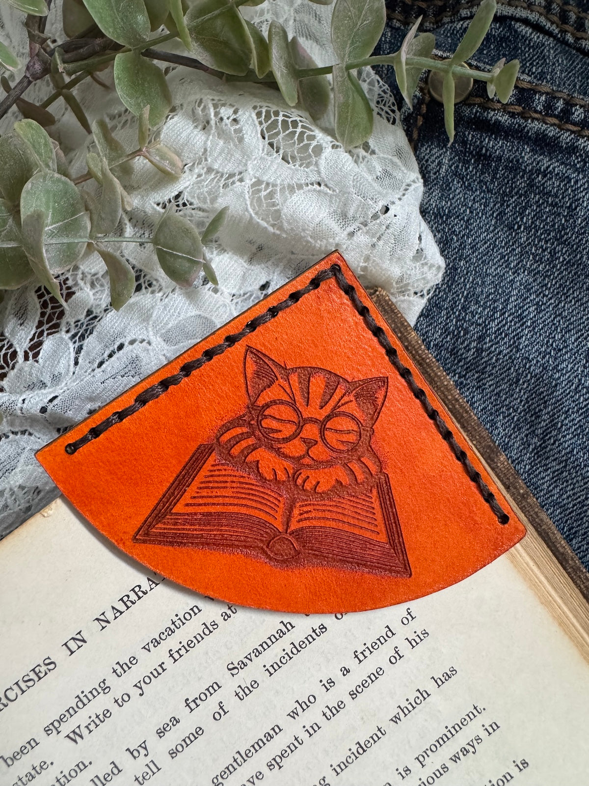 Crafted from hand-dyed, hand-stitched leather and finished with a protective acrylic resolene seal, this corner-style bookmark is designed to stay put while keeping your place — and your pages safe. The charming cat illustration paired with the thoughtful quote makes it a perfect gift for readers who love quiet moments, loyal companions, and the kind of stories that never let you down.