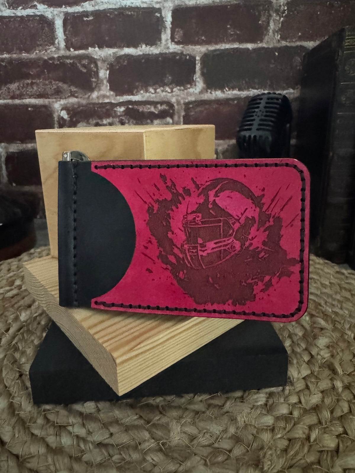 Bring your love of the game into your everyday carry with this handcrafted Football Leather Wallet with Money Clip. Featuring a bold and dynamic engraving of a football helmet, this handmade leather wallet captures the grit and adrenaline of the gridiron. Whether you're cheering from the bleachers, coaching from the sidelines, or just passionate about the sport, this is the perfect gift for football fans, athletes, and sports dads.
