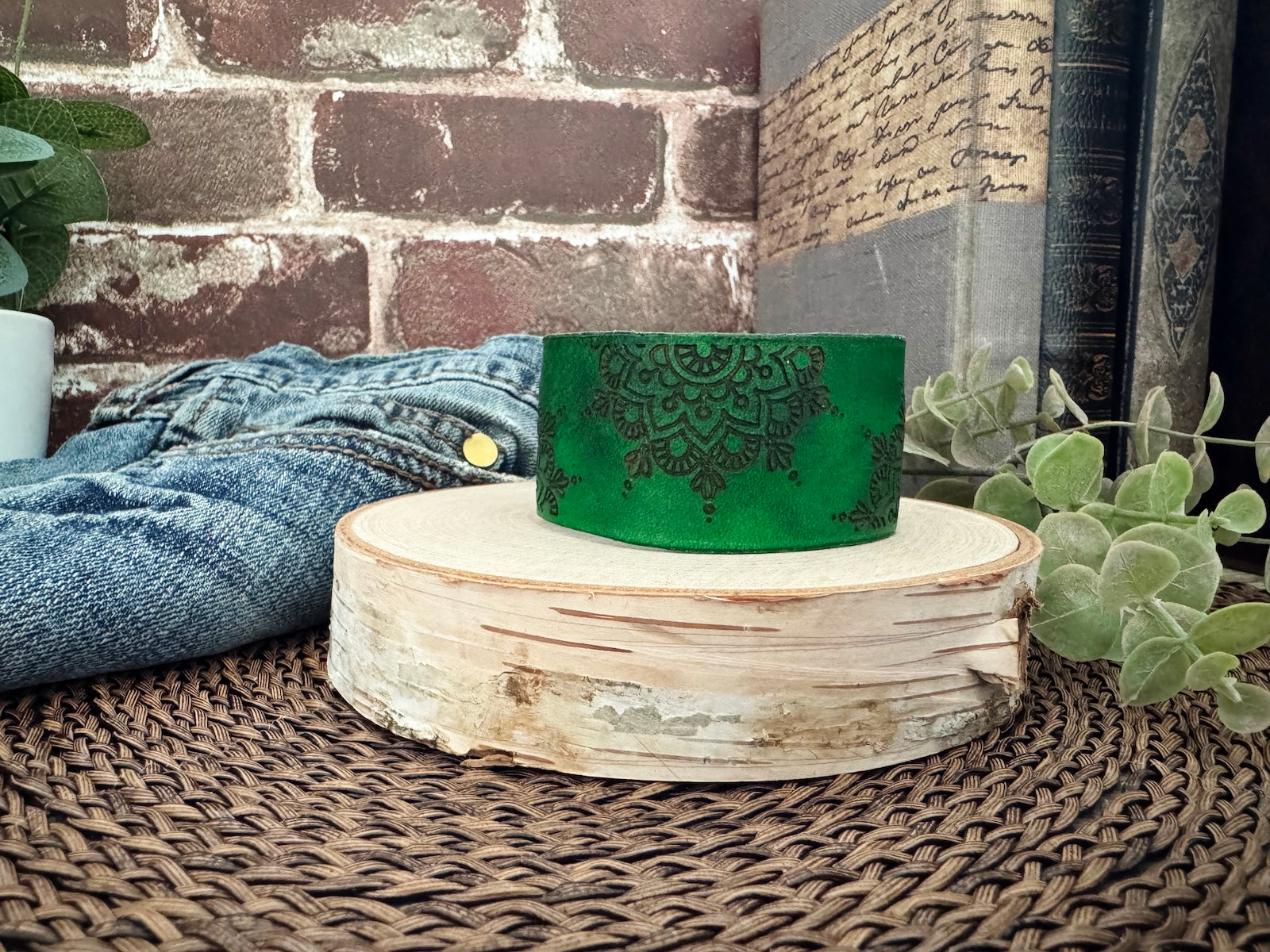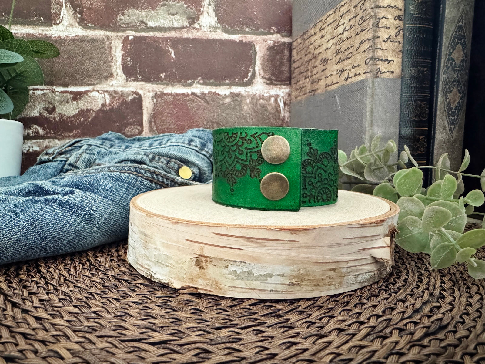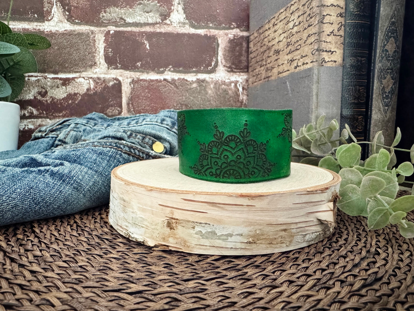 Bring a bold pop of color and intricate detail to your everyday look with this handmade Mandala Leather Cuff. Made from premium vegetable-tanned leather, this cuff features a deeply engraved mandala design—an elegant blend of symmetry and style. It's hand-dyed and sealed with resolene for a soft sheen and long-lasting wear.