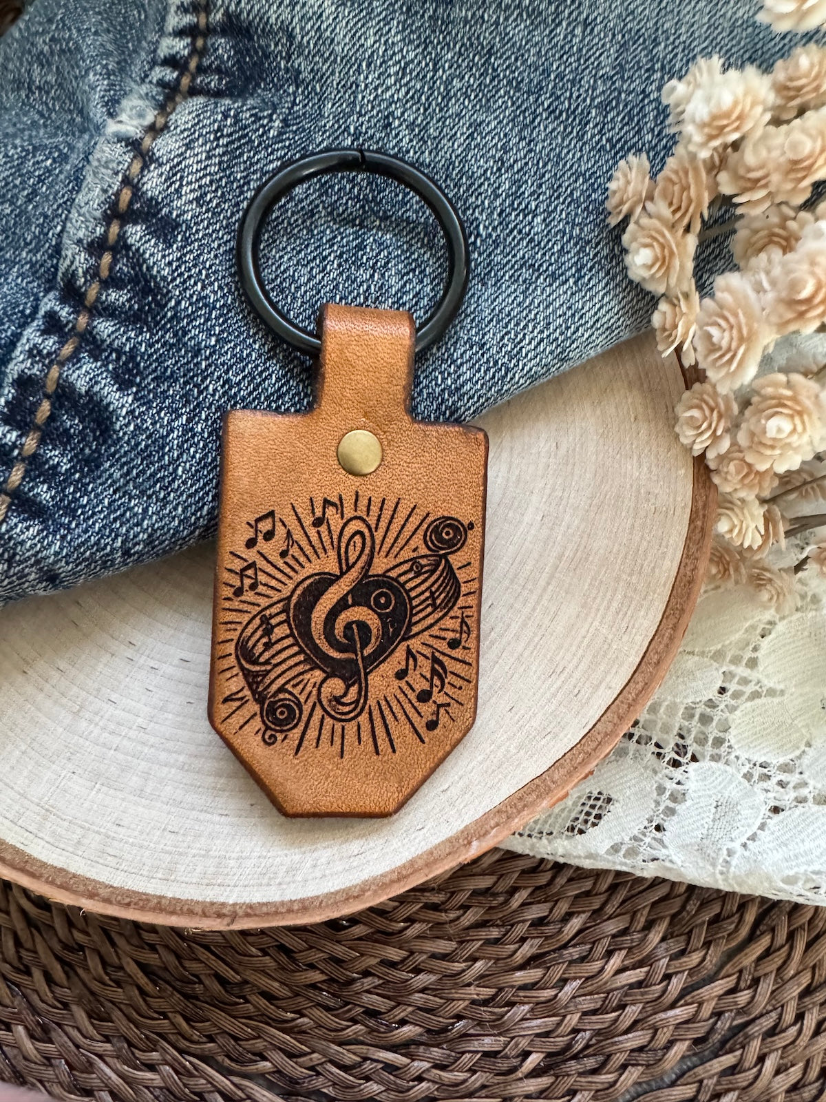 Each piece is hand-dyed and sealed with resolene for lasting durability and a polished finish. This keychain is both a meaningful gift for musicians and a practical daily accessory.