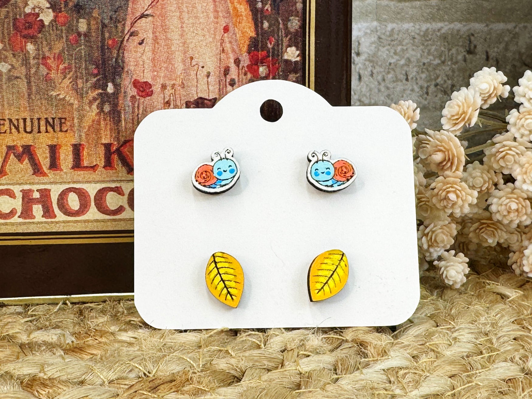 Slow down and embrace nature with our Snail & Leaf Stud Wooden Earrings. This charming set includes a pair of adorable cartoon snail earrings and a pair of elegant leaf earrings, both expertly laser engraved onto premium wood. Each pair is individually hand-painted, ensuring that every set of Snail & Leaf Stud Wooden Earrings is as unique and nature-inspired as the wearer. You'll be the crowned ruler of the garden path!