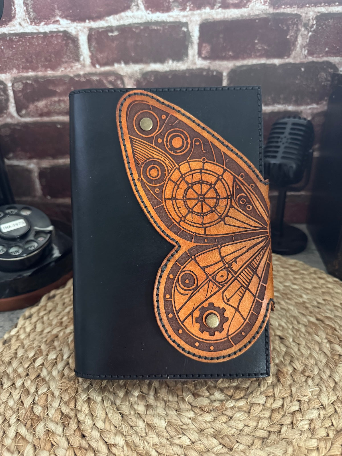 Where elegance takes flight and machinery meets imagination, the Steampunk Butterfly Leather Notebook is a striking blend of grace and grit. Designed for writers, artists, and fans of the fantastical, this handcrafted leather journal features a bold, gear-filled butterfly wing enclosure that wraps from front to back. Laser-engraved and stitched in place, the wing adds dimension and personality while securing the journal closed with a subtle snap. A few carefully placed rivets give the butterfly an industrial accent, evoking the spirit of invention and transformation.